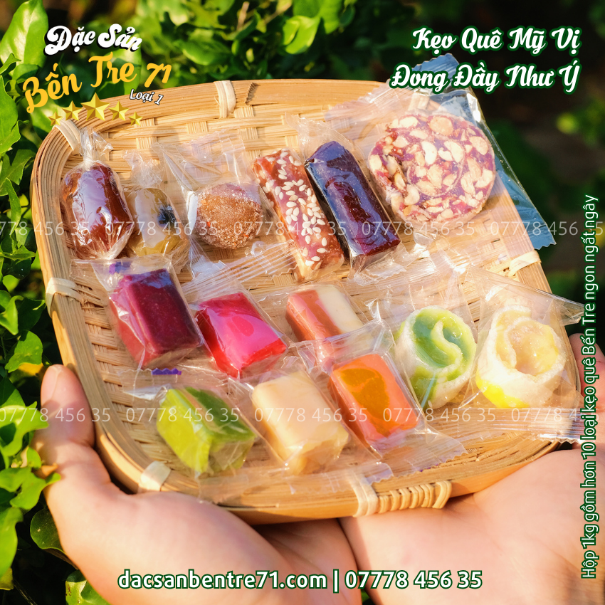 Tất cả kẹo trong hộp 1KG đều được làm từ nguyên liệu thiên nhiên, không phẩm màu độc hại, không chất bảo quản. Đảm bảo an toàn – tươi ngon – chuẩn vị đặc sản Bến Tre.