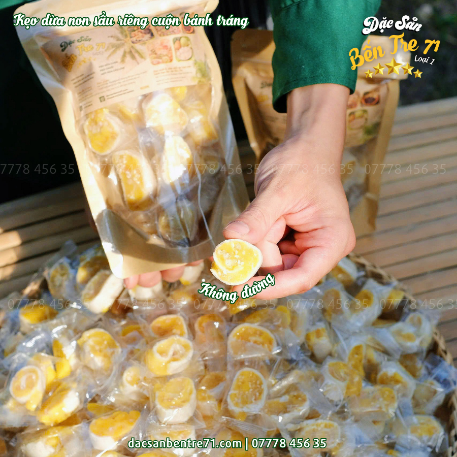 Sản phẩm kẹo dừa non sầu riêng cuộn bánh tráng không đường của Đặc Sản Bến Tre 71 được làm hoàn toàn bằng tay, tuân thủ quy trình vệ sinh an toàn thực phẩm: