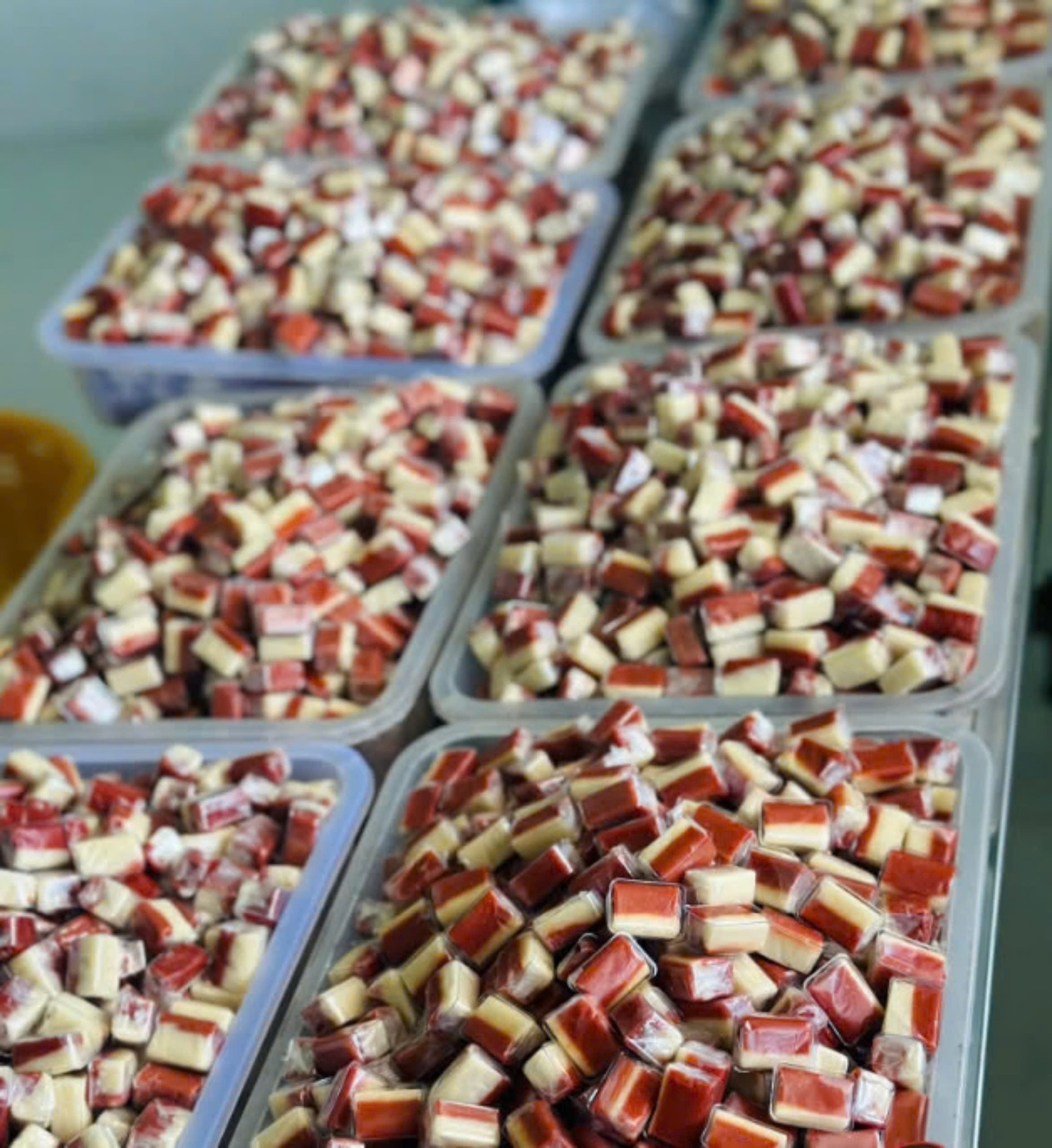 Đổ khuôn và cắt kẹo: Hỗn hợp sau khi đạt độ kết dính mong muốn được đổ ra khuôn và để nguội. Sau đó, kẹo được cắt thành từng viên nhỏ.