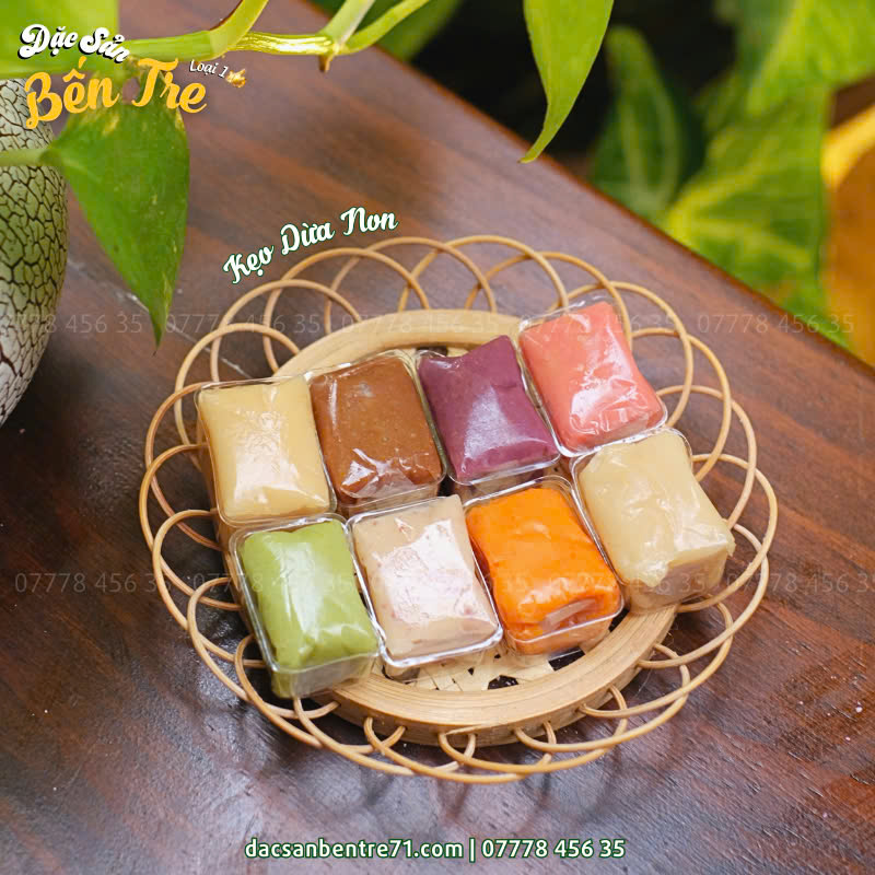 Kẹo dừa non Bến Tre từ lâu đã trở thành biểu tượng ẩm thực của miền Tây Nam Bộ, nổi tiếng với hương vị thơm ngon và ngọt ngào. Làm từ cơm dừa non tươi, kẹo dừa Bến Tre mang đến vị béo bùi của dừa hòa quyện với vị ngọt thanh của đường. Những miếng kẹo mềm mịn, dẻo dai nhưng không quá dính, mang đến trải nghiệm ẩm thực tuyệt vời cho người thưởng thức.