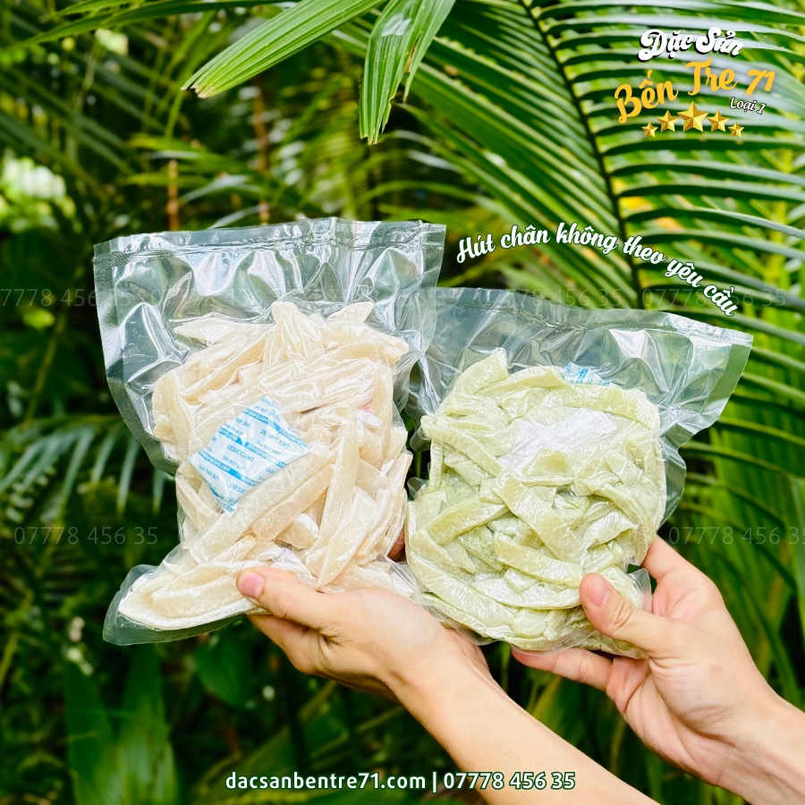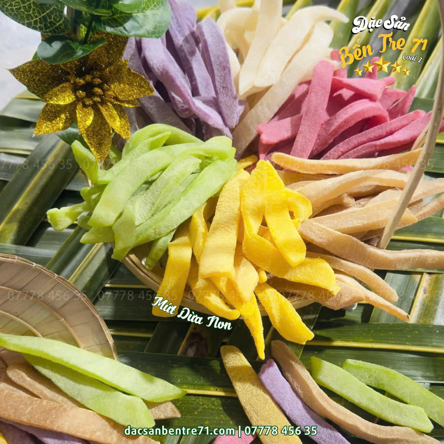 Mứt dừa non dẻo của Đặc Sản Bến Tre 71 được làm từ cơm dừa non tươi, được chọn lọc kỹ lưỡng. Cơm dừa được nạo sợi mỏng, rửa sạch và ngâm nước để loại bỏ dầu và vị chát. Sau đó, cơm dừa được ướp đường tinh khiết và để ngấm trong vài giờ. Quá trình sên mứt là bước quan trọng, cơm dừa ướp đường được nấu trên lửa nhỏ, khuấy đều tay cho đến khi đường kết tinh và bám vào sợi dừa. Mứt dừa thành phẩm có vị ngọt thanh, dẻo mềm và thơm ngon, thích hợp làm món ăn vặt hay quà tặng trong các dịp lễ Tết.