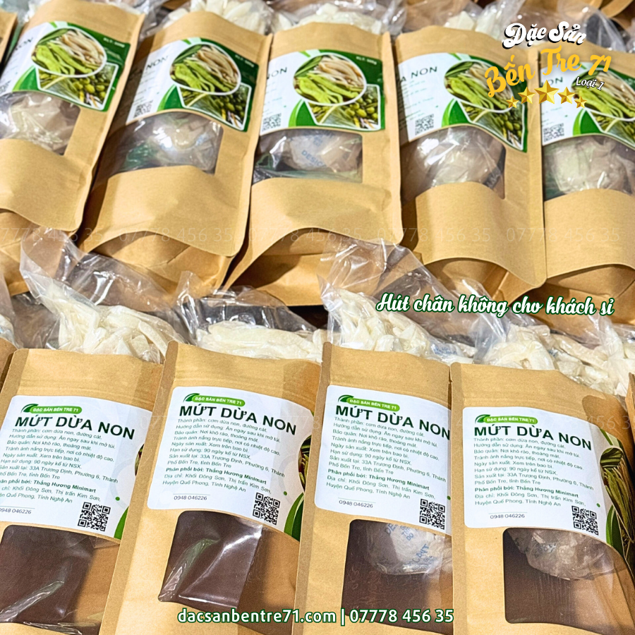 Để đảm bảo chất lượng sản phẩm và uy tín trong kinh doanh, việc lựa chọn nguồn hàng đáng tin cậy là vô cùng quan trọng. Đặc Sản Bến Tre 71 tự hào là địa chỉ cung cấp mứt dừa non chất lượng cao, được sản xuất từ những trái dừa non tươi ngon nhất. Với quy trình sản xuất hiện đại kết hợp cùng phương pháp truyền thống, mứt dừa non của Đặc Sản Bến Tre 71 giữ nguyên hương vị đặc trưng, đảm bảo vệ sinh an toàn thực phẩm.