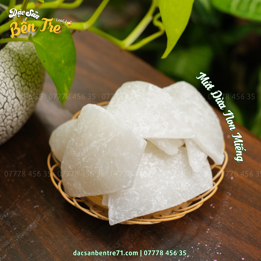 Mứt dừa non là sản phẩm được làm từ phần cơm dừa mềm, dẻo và béo ngậy của trái dừa còn non. Điểm đặc biệt của loại mứt này là độ dẻo và ngọt thanh, khác biệt hoàn toàn so với các loại mứt dừa già thường thấy. Khi thưởng thức, bạn sẽ cảm nhận ngay sự mềm mại tan chảy trong miệng, kết hợp cùng hương dừa tự nhiên, khiến vị giác như được đánh thức ngay từ miếng đầu tiên.