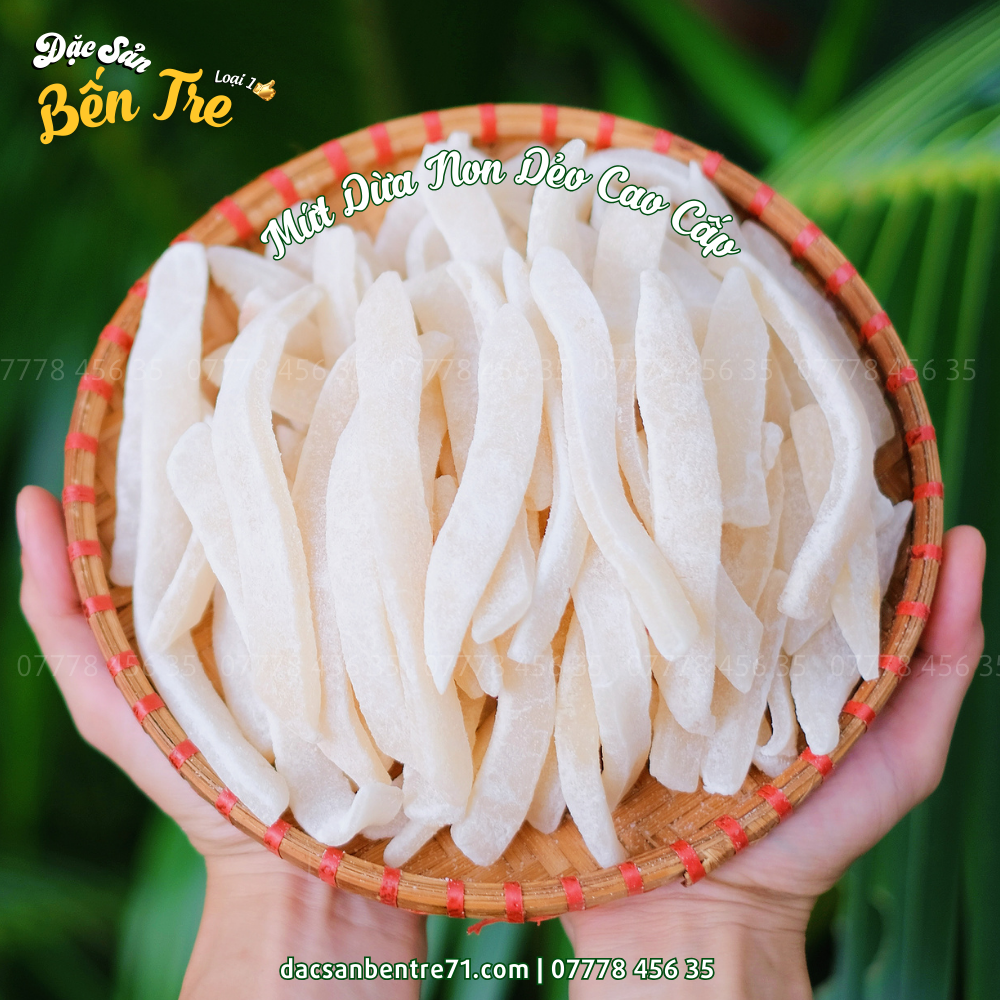 Mứt dừa Bến Tre được làm từ những trái dừa non tươi ngon nhất. Cơm dừa được chọn lọc kỹ lưỡng, nạo thành sợi mỏng và ướp với đường tinh khiết, đảm bảo độ ngọt tự nhiên. Quá trình sên mứt được thực hiện thủ công, từng bước một, để giữ nguyên hương vị và độ dẻo mềm của dừa.